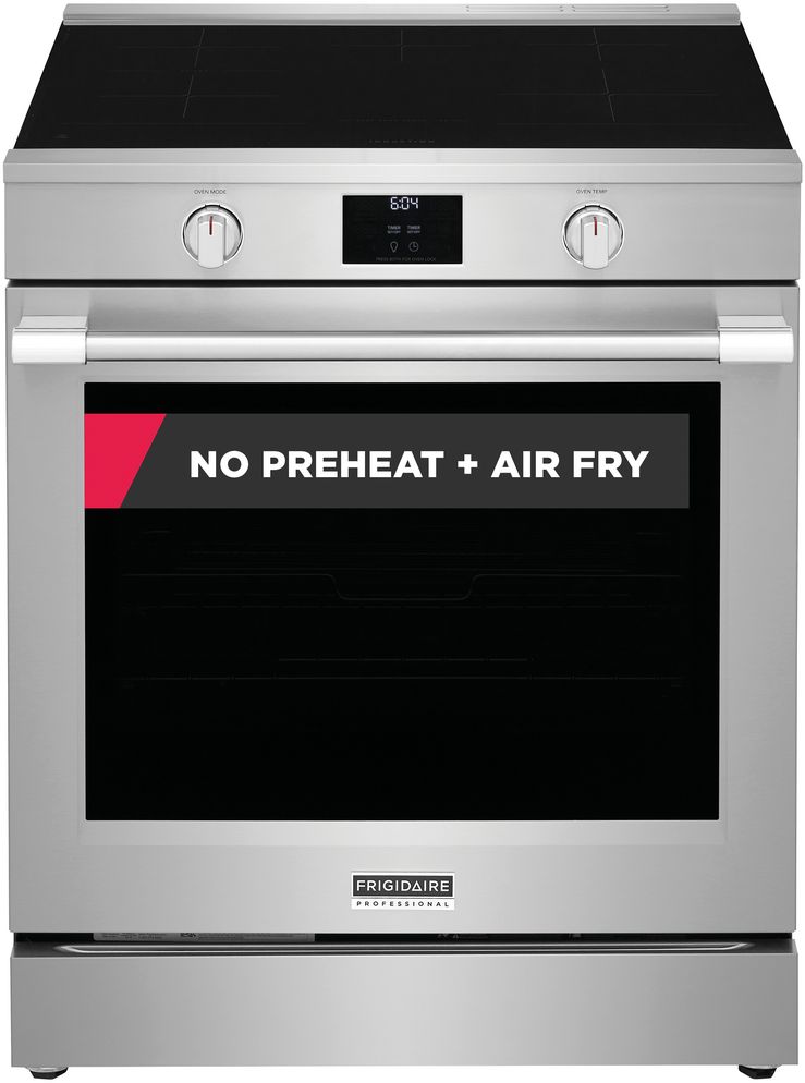 The Frigidaire Professional 30" Front Control Induction Range features our most powerful and advanced convection system, Total Convection, which enables cooking modes like No Preheat, Air Fry, Slow Cook, Steam Bake, Steam Roast, Convection Bake and more! Enjoy the cleanability and amazingly fast speed of cooking with induction. Also includes a convenient Temperature Probe, Air Fry Tray, Backlit LED knobs, Glide Rack and features our fingerprint resistant, Smudge-Proof® Stainless Steel finish.